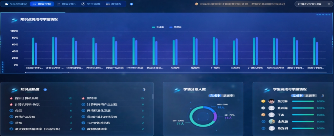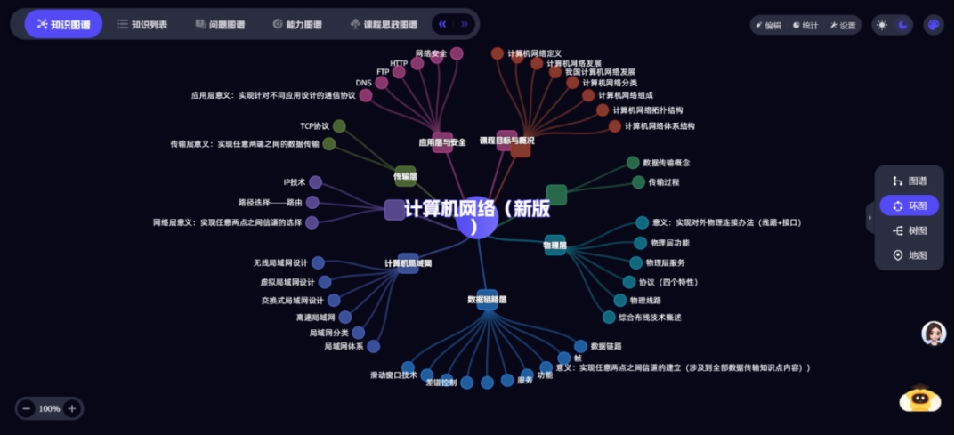 课程团队基于超星泛雅平台,集成DeepSeek-化大小计等大模型能力,打造《计算机网络》智慧课程平台,建立97个知识点、14个知识点资源、1260个教学资源、54个拓展资源,形成知识图谱、能力图谱、课程思政图谱等相关数字资源,为智慧课程建设打下良好的基础。学生可通过自然语言提问,AI助手即时生成可视化解析,学生学习的效率得到大幅度提升。
