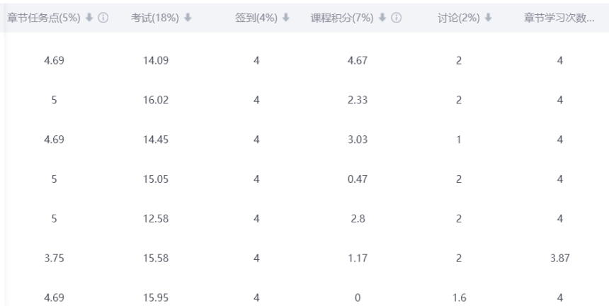 章节学习过程(4分):在课程在线资源中,每个章节有相应内容讲解视频或PPT,学生利用课下时间自主完成,考查学生主动学习的情况,由平台自动分析并获得相应分数。